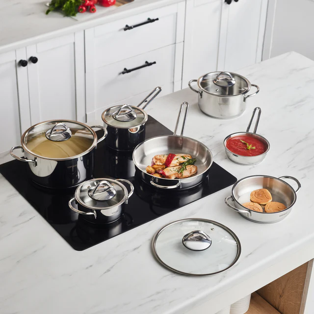 Stainless steel pots and pans collection offers durability and versatility. Ideal for home cooks who value reliable cookware sets that deliver even heat distribution for a variety of dishes, from soups to sauces. Each cooking set is compatible with all hobs, including induction, making it perfect for busy families. Designed for convenience, this low-maintenance kitchenware range is dishwasher safe and made to last — the perfect stainless steel pots and pans set for effortless everyday cooking.